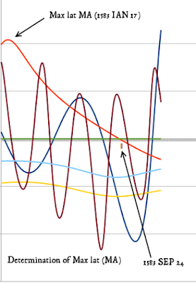 It should be noted that the planetary nodes which are calculated are only the reflection of the maximum inclination i, in the sense of Morin de Villefranche. in no case are these 'real' geocentric nodes. For instance, the graphic hereunder is an example of determination of maximum latitude for MA.